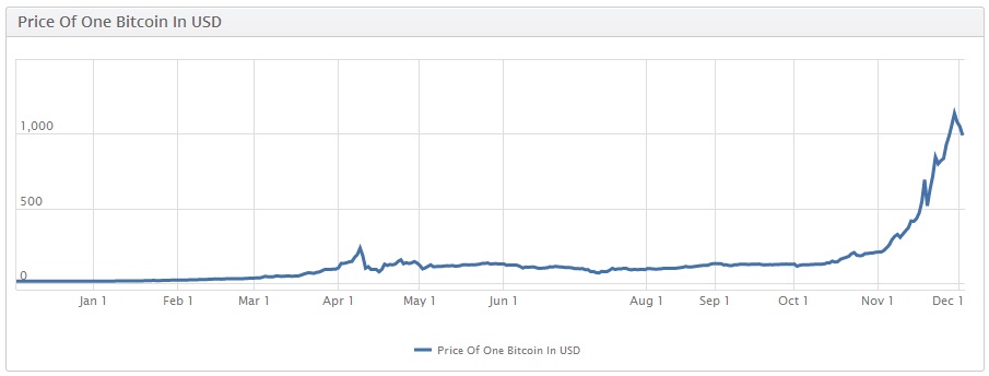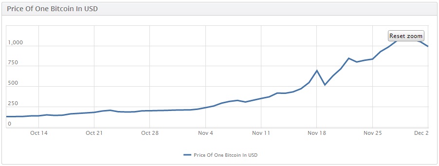 قیمت بیت کوین هم اکنون در زمان نوشتن این مطلب ۱۱۴۶ دلار، کمی پایین تر از قیمت هر اونس طلا که ۱۲۴۶ دلار آمریکا می باشد است. قیمت بیت کوین طی چند روز اخیر برای اولین بار به بیش از ۱۰۰۰ دلار آمریکا رسید. این طور که به نظر می رسد بیت کوین دیگر یک واحد پولی ارزان قیمت نیست. در زیر نمودار تغییرات قیمت بیت کوین را در چند ماه اخیر مشاهده می کنید. گفته می شود از جمله دلایل افزایش چشم گیر قیمت بیت کوین افزایش محبوبیت آن در کشور چین و بالا رفتن مبادلات آن است. از دلایل دیگر آن شاید شکست وبسایت راه ابریشم باشد که در ازای بیت کوین مواد مخدر خرید و فروش می کرد.